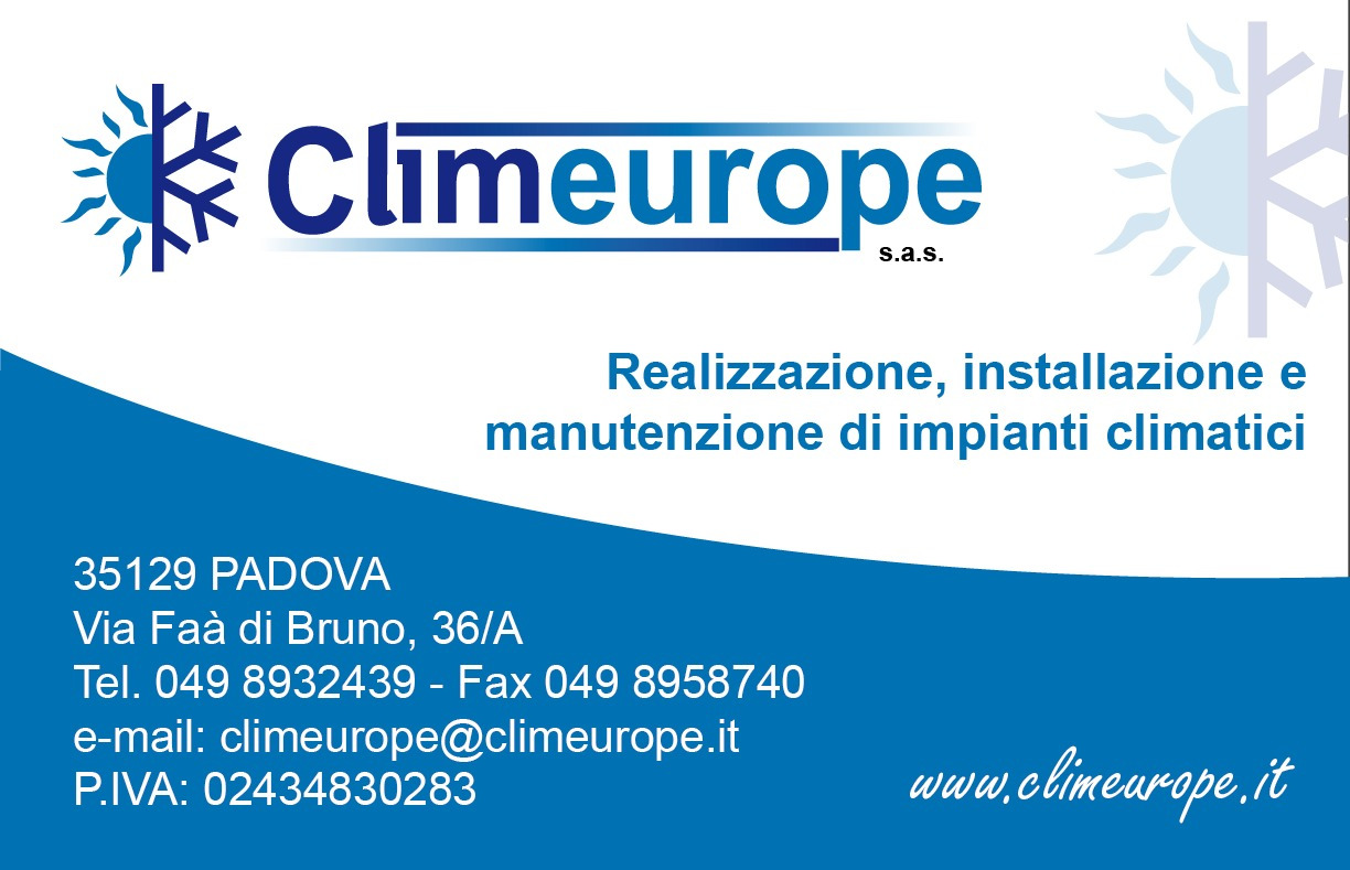 Climeurope S.n.c. è una società che nasce nel contesto di un gruppo di tecnici qualificati nella tecnica della Refrigerazione industriale e del condizionamento dell'aria in generale, quest'ultimi capitanati a un responsabile tecnico aziendale con esperienza Trentennale nel settore tecnico impiantistico, che si muovono nel territorio per svolgere il servizio di assistenza tecnica pre / post vendita in zona Padova e Provincia e nel Triveneto.